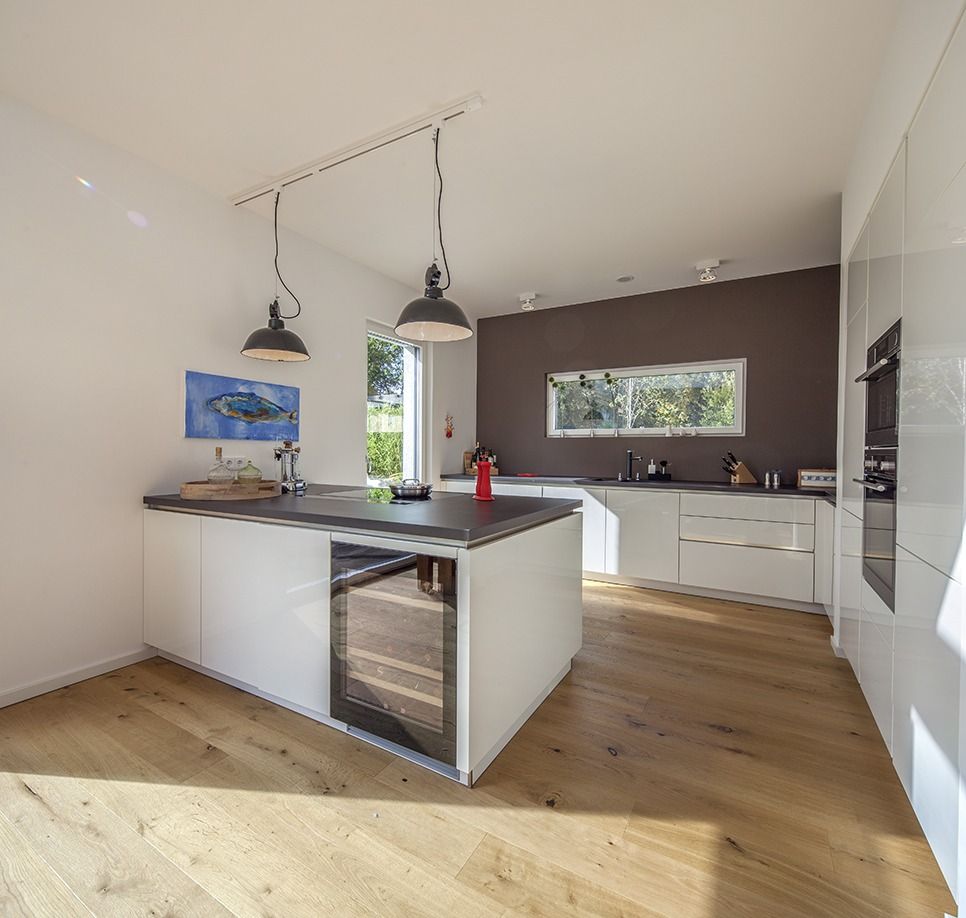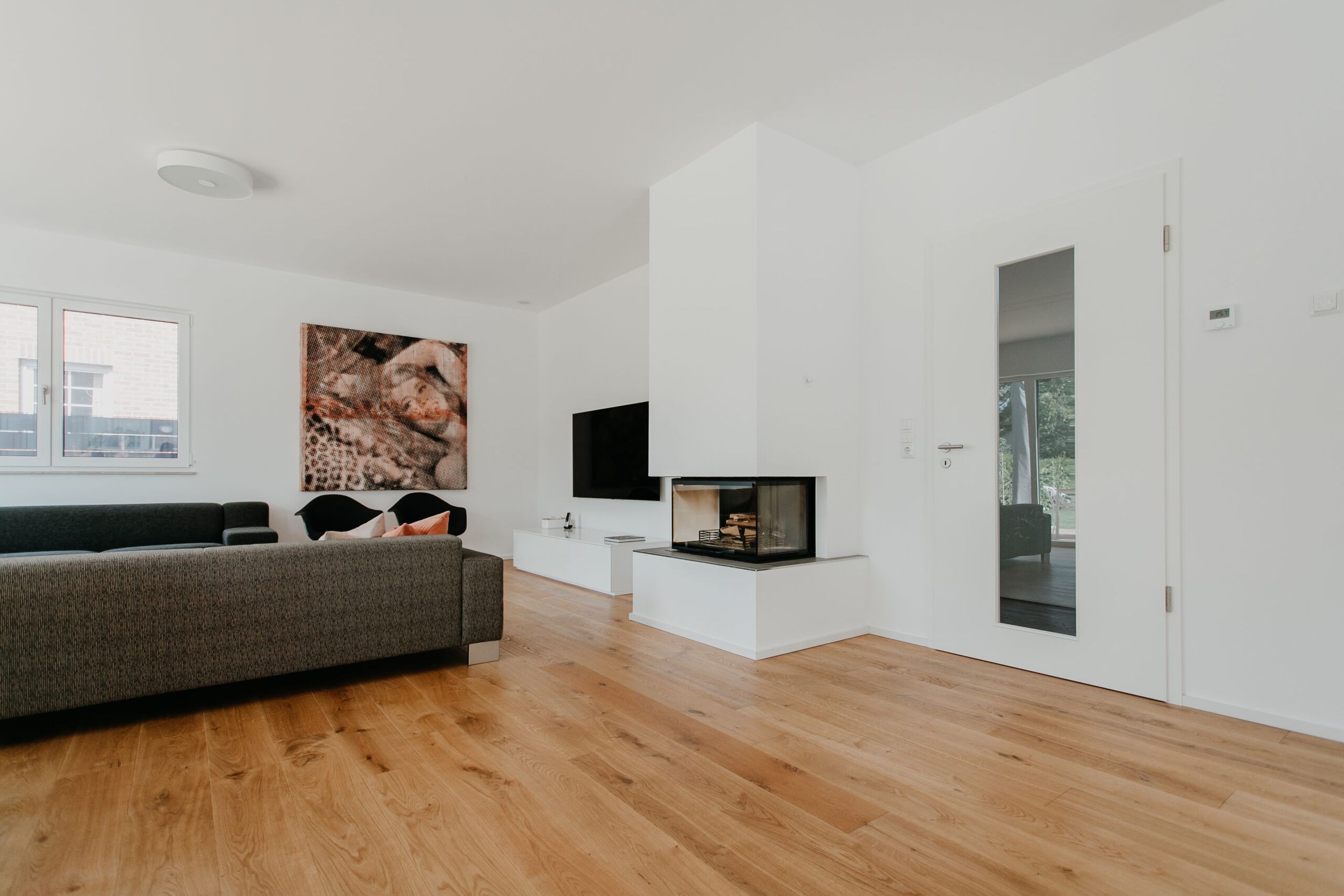 - Eine schnelle Bauzeit wünschten sich alle Beteiligten. Mit ein bis zwei Tagen Richtzeit für den Rohbau lässt sich mit dem massiven Holzbausystem von Swiss Krono deutlich schneller bauen als es die herkömmliche Holzrahmenbauweise ermöglicht. Da die Innenwände direkt beschichtet werden können, braucht es keine Beplankung mit Gipskarton. Auch das spart Zeit. Dass keine zusätzliche Installationsebene nötig ist, weil bereits alle Kanäle während der Vorfertigung in die Elemente eingearbeitet werden, beschleunigte den Baufortschritt zusätzlich.